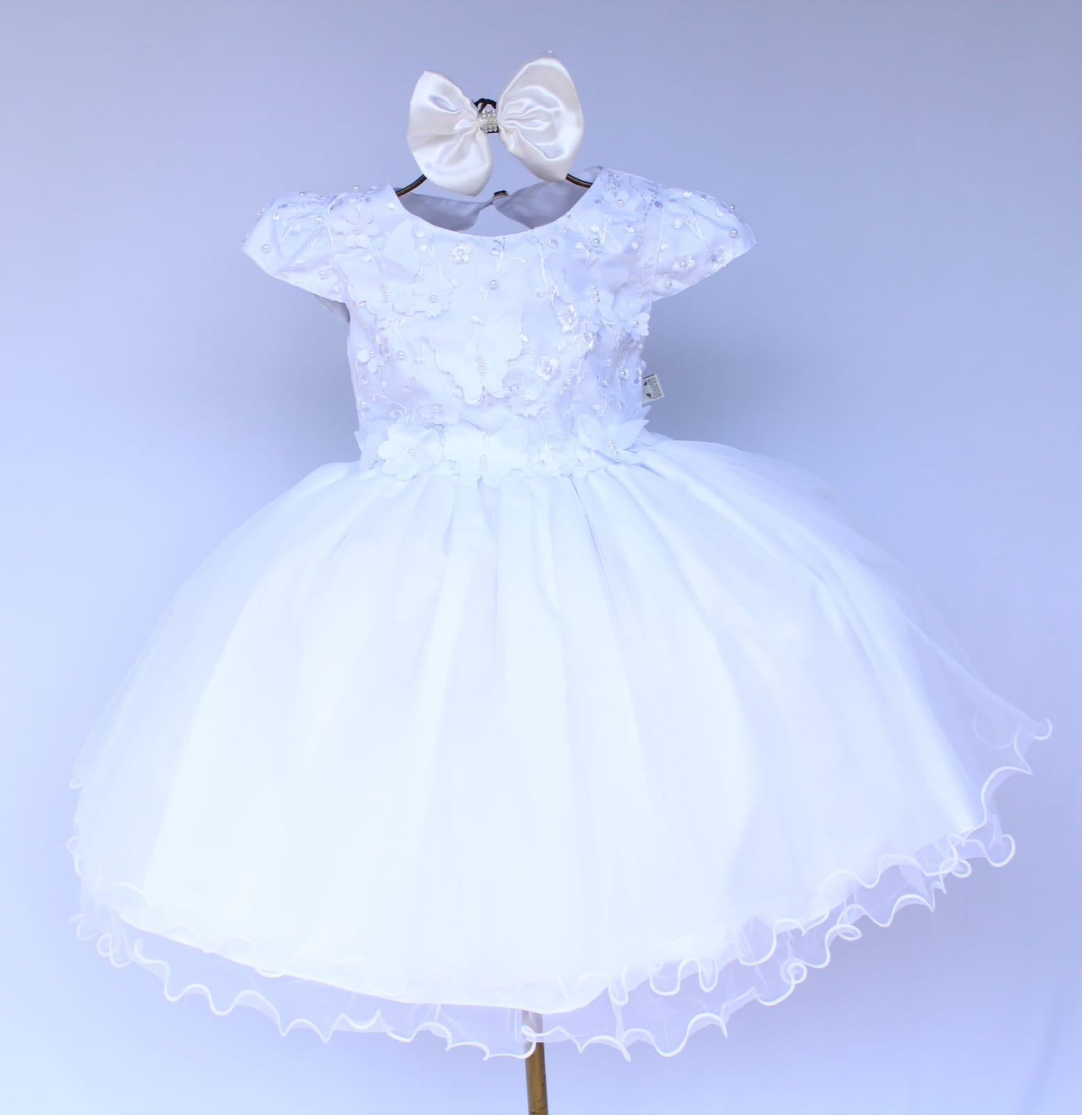 Confeccionado em tecido misto possui forro em poliéster e algodão que não encomoda a criança e proporciona um caimento incrível e sofisticado, possui gola redonda, comprimento médio, mangas curtas, possui elástico nas costas para melhor ajuste, acabamento com lindo laço na parte posterior do vestido.