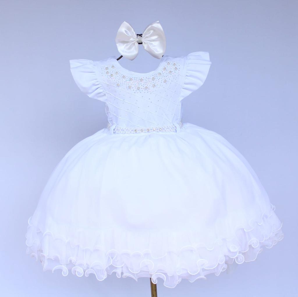 Confeccionado em tecido misto possui forro em poliéster e algodão que não encomoda a criança e proporciona um caimento incrível e sofisticado, possui gola redonda, comprimento médio, mangas curtas, possui elástico nas costas para melhor ajuste, acabamento com lindo laço na parte posterior do vestido.