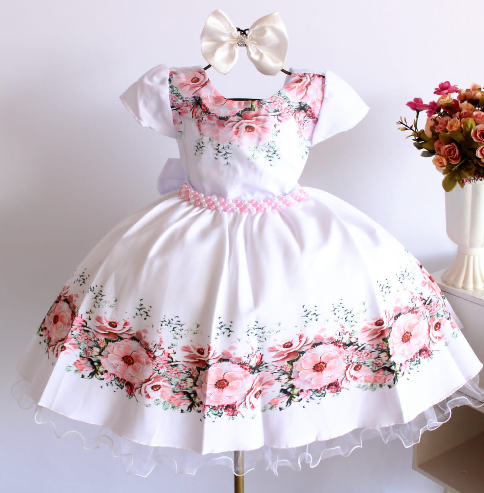 Confeccionado em tecido misto possui forro em poliéster e algodão que não encomoda a criança e proporciona um caimento incrível e sofisticado, possui gola redonda, comprimento médio, mangas curtas, possui elástico nas costas para melhor ajuste, acabamento com lindo laço na parte posterior do vestido.