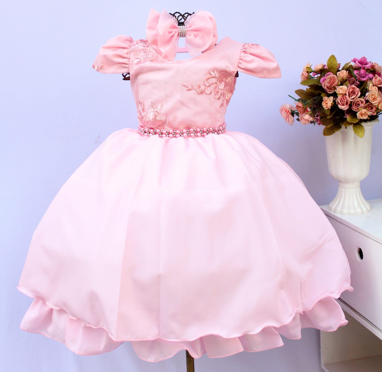 Confeccionado em tecido misto possui forro em poliéster e algodão que não encomoda a criança e proporciona um caimento incrível e sofisticado, possui gola redonda, comprimento médio, mangas curtas, possui elástico nas costas para melhor ajuste, acabamento com lindo laço na parte posterior do vestido.