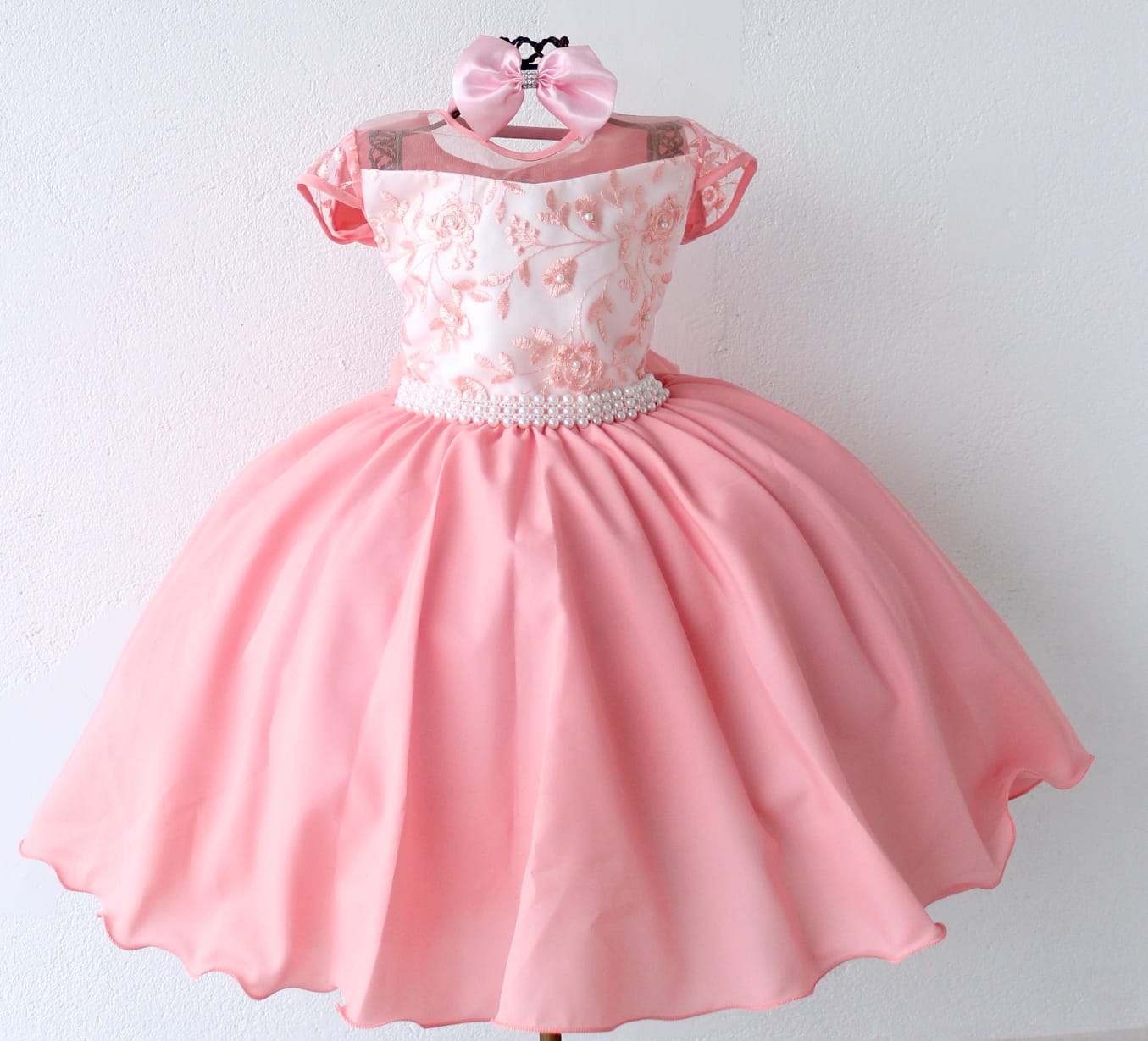 Confeccionado em tecido misto possui forro em poliéster e algodão que não encomoda a criança e proporciona um caimento incrível e sofisticado, possui gola redonda, comprimento médio, mangas curtas, possui elástico nas costas para melhor ajuste, acabamento com lindo laço na parte posterior do vestido.