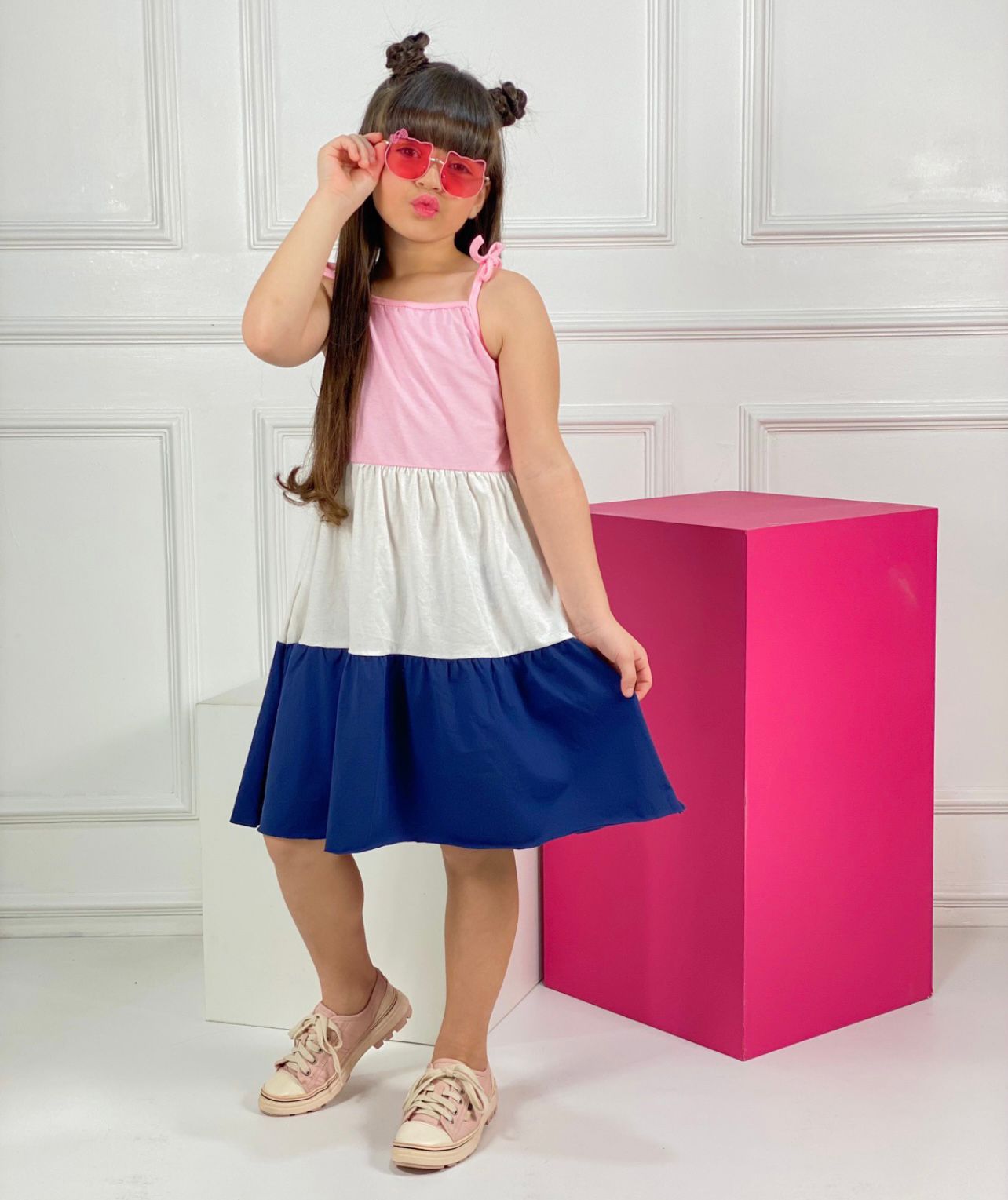 Confeccionado em tecido misto possui forro em poliéster e algodão que não encomoda a criança e proporciona um caimento incrível e sofisticado, possui gola redonda, comprimento médio, mangas curtas, possui elástico nas costas para melhor ajuste, acabamento com lindo laço na parte posterior do vestido.