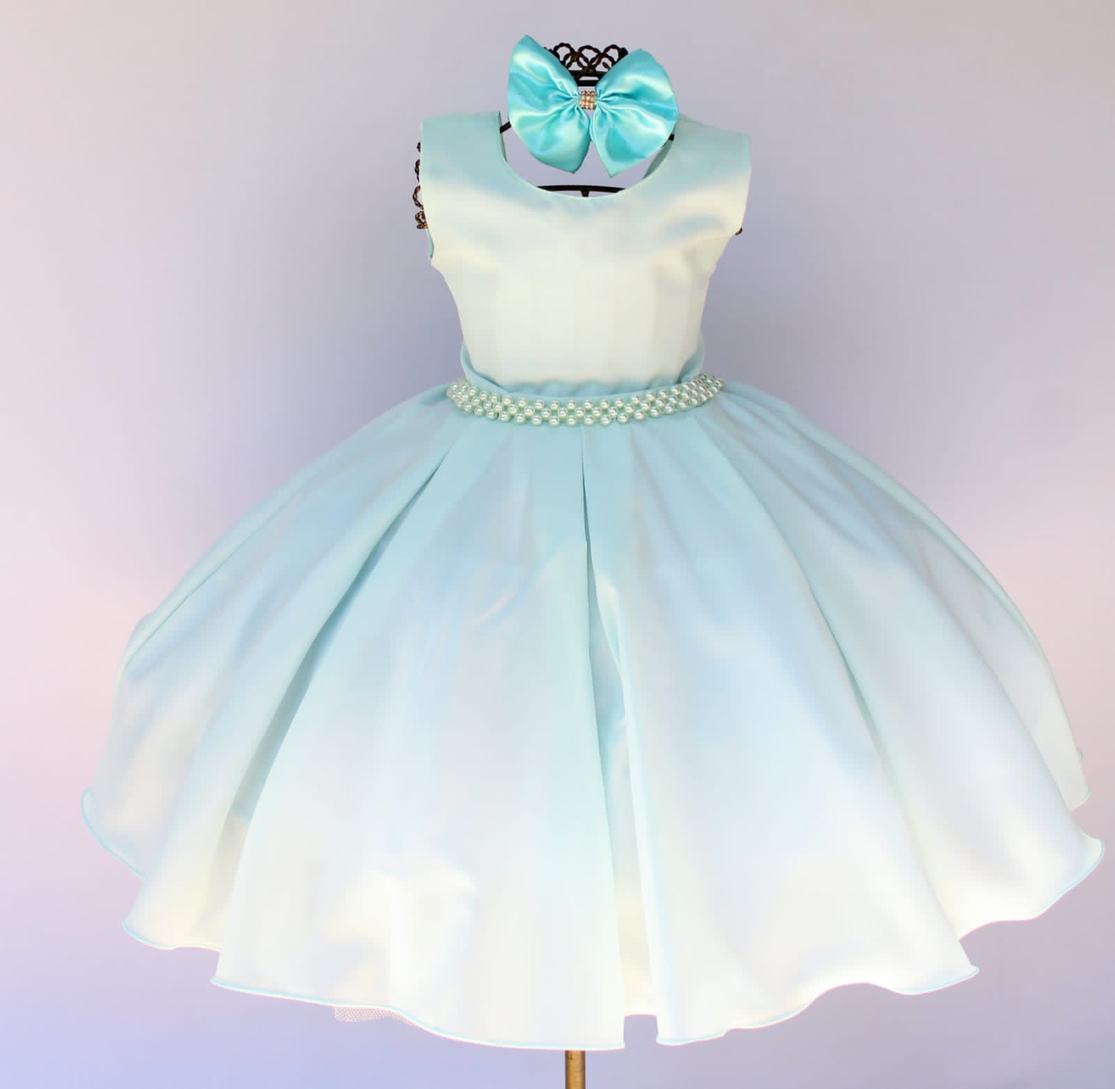 Confeccionado em tecido misto possui forro em poliéster e algodão que não encomoda a criança e proporciona um caimento incrível e sofisticado, possui gola redonda, comprimento médio, mangas curtas, possui elástico nas costas para melhor ajuste, acabamento com lindo laço na parte posterior do vestido.